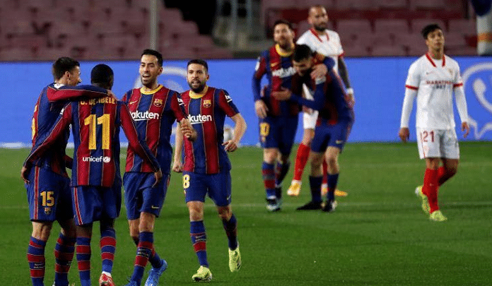 来源:925直播吧03-04 19:48925直播吧3月4日讯 国王杯半决赛次回合巴萨上演神奇逆转,他们在主场通过加时赛以3-0击败塞维利亚,总分3-2逆转对手,挺进到了本赛季国王杯决赛。这场比赛巴萨赢得非常惊险,登贝莱早早取得进球,但塞维利亚获得点球,好在特尔施特根神奇扑点成功,如果点球打进的话,巴萨需要再进3球才行。接下来神剧情出现,常规时间内第93分08秒,皮克进球扳平比分,比赛进入到加时赛。加时赛布莱斯维特头球为巴萨反超,巴萨顶住压力,成功晋级到国王杯决赛。