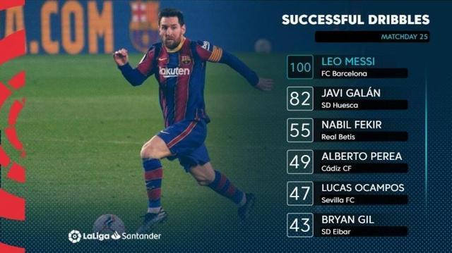 925直播吧3月4日讯 3月3日 据西甲官方公布数据显示,截止到第25轮,巴萨前锋梅西在23场比赛中,录得100次成功带球过人的数据,位列过人榜单之首。