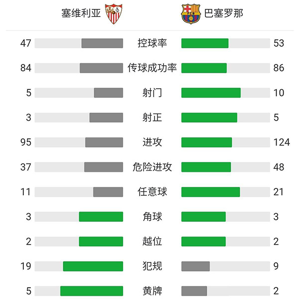 全场比赛结束,巴塞罗那客场2-0战胜塞维利亚。