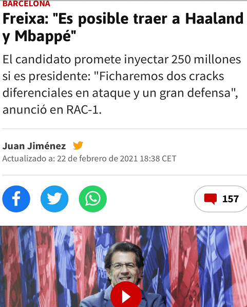 巴萨主帅科曼也谈到了引援需要等到新主席上任之后才有行动,而巴萨主席候选人之一的托尼-弗雷萨就在接受采访的时候放出豪言,他表示自己能够拉来投资,具体的数额是2亿5千万欧元,用于运营与“巴萨企业”(BarçaCorporate)相关的49%的业务。有了这些资金,他将签下两个明星:前锋和后卫。同时如果他上任将极有可能拿下哈兰德和姆巴佩,而且是一起为巴萨效力。