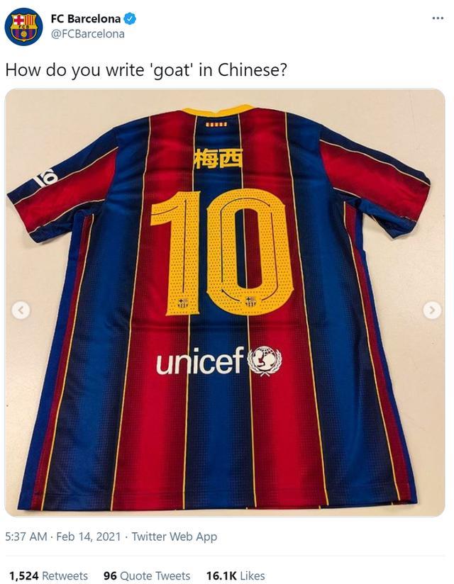 在官推上,巴萨晒出了梅西中文球衣的照片,并写道:“GOAT用中文怎么写?”