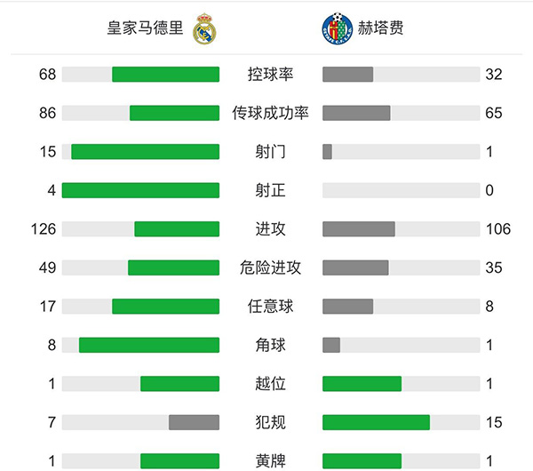全场结束,皇马主场2-0击败赫塔费。