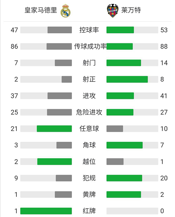 全场比赛结束,皇马主场1-2被莱万特逆转。