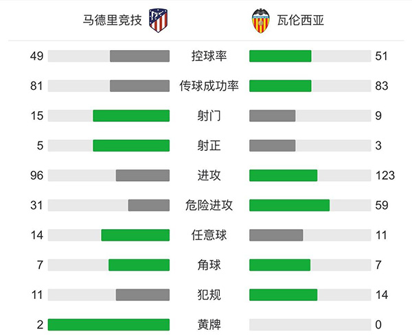 全场比赛结束,马竞3-1逆转战胜瓦伦西亚,联赛七连胜领跑积分榜。