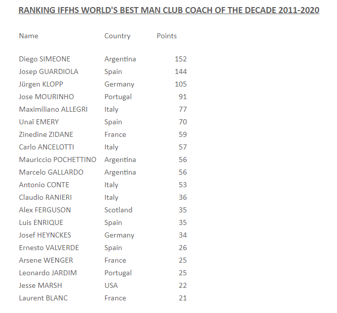 IFFHS评足坛十年最佳主帅:西蒙尼榜首,穆帅仅第四!