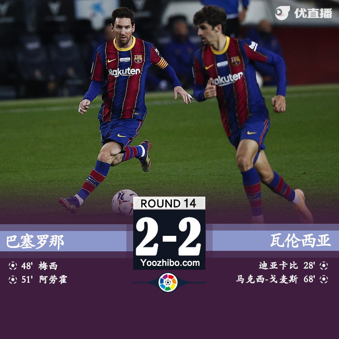西甲简报:巴塞罗那2-2战平瓦伦西亚 梅西失点+头球建功