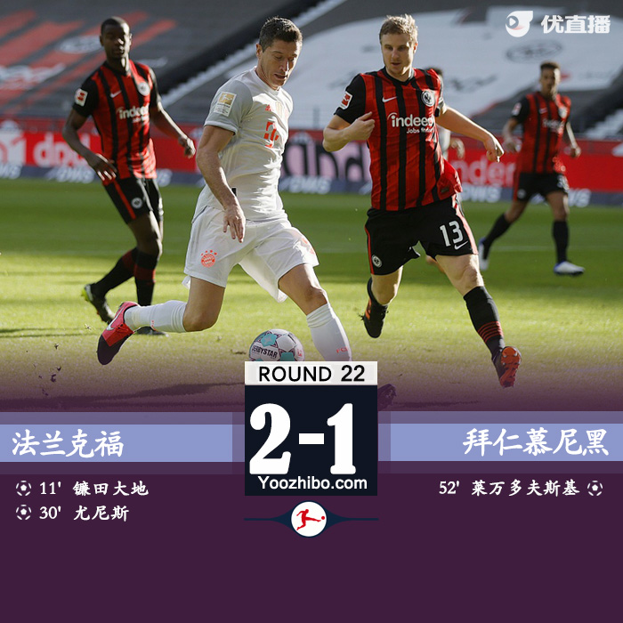 925直播吧2月20日讯 北京时间2021年2月20日22:30,2020-21赛季德甲第22轮,拜仁慕尼黑客场挑战法兰克福。上半时镰田大地先开纪录,随后尤尼斯世界波破门,边裁因伤换人。下半时萨内助攻莱万破门,科曼错失良机。最终,法兰克福2-1战胜拜仁,拜仁两轮联赛不胜。