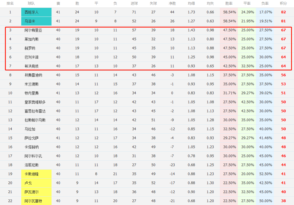 来源:925直播吧05-24 18:06925直播吧讯 西乙联赛已经诞生了2个直接升甲球队,分别是西班牙人和马略卡,两队拿到了新赛季西甲的参赛资格,剩下的一个名额将由第三四五六名通过附加赛产生。目前5队在竞争附加赛区的4个名额,分别是第三名的阿尔梅里亚(67分)、第四名的莱加内斯(67分)、第五名的赫罗纳(67分)、第六名的巴列卡诺(64分)、第七名的希洪竞技(64分),五队的第41轮比赛还未开打,竞争形势可以说相当混乱,争六悬念巨大。
