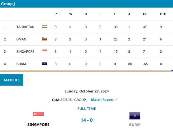 这还没完,随后关岛0-18再次完败给阿曼。随着本轮,连东南亚弱旅新加坡都能14-0赢他们。关岛队3场比赛进0球丢65球,排名J组积分榜垫底。