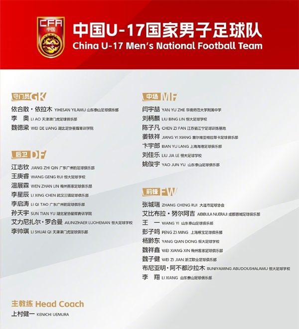 来源:925直播吧02-27 17:11925直播吧讯北京时间2月27日,为了备战4月份的U17亚洲杯(亚少赛),中国足协公布了U17国足最新27人名单。艾比布拉、魏祥鑫、依合散、卞宇郎、姚俊宇等多位年轻才俊皆榜上有名。