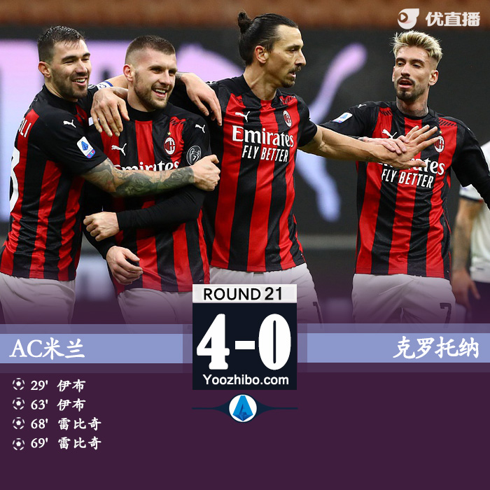 925直播吧2月7日讯 北京时间2月7日22:00,意甲联赛第21轮一场比赛在AC米兰和克罗托内之间进行。上半场卡拉布里亚破门但因伊布越位在先进球无效,伊布推射打入个人俱乐部生涯500球。下半场特奥助攻伊布梅开二度,恰尔汗奥卢复出贡献两粒助攻,雷比奇一分钟双响。最终米兰4-0大胜克罗托内,在积分榜反超国米2分重回榜首。