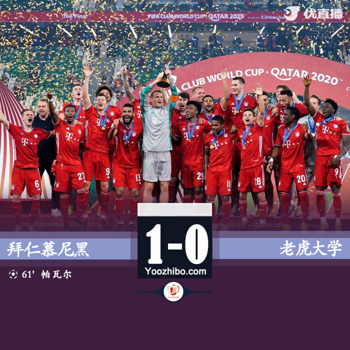 925直播吧2月12日讯 北京时间2月12日凌晨2点,世俱杯决赛,拜仁慕尼黑对阵老虎大学队。上半时双方互交白卷,基米希世界波破门被吹无效,萨内中门框。下半时帕尔瓦攻入制胜一球,托利索远射被扑击中门柱,科斯塔错失机会。最终,拜仁慕尼黑1-0战胜老虎大学,拜仁获得世俱杯冠军,成功加冕六冠王。